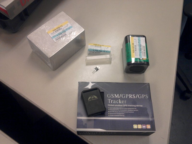 1 - Personal GPStracker kit 1 - BIG battery 1 - Resistance 1 - Encasement 1 - Simcard (already in the tracker) not on picture: - A Cabledrum(!) - A means of attaching the encasement to the drum - Some screws, bolts, etc.